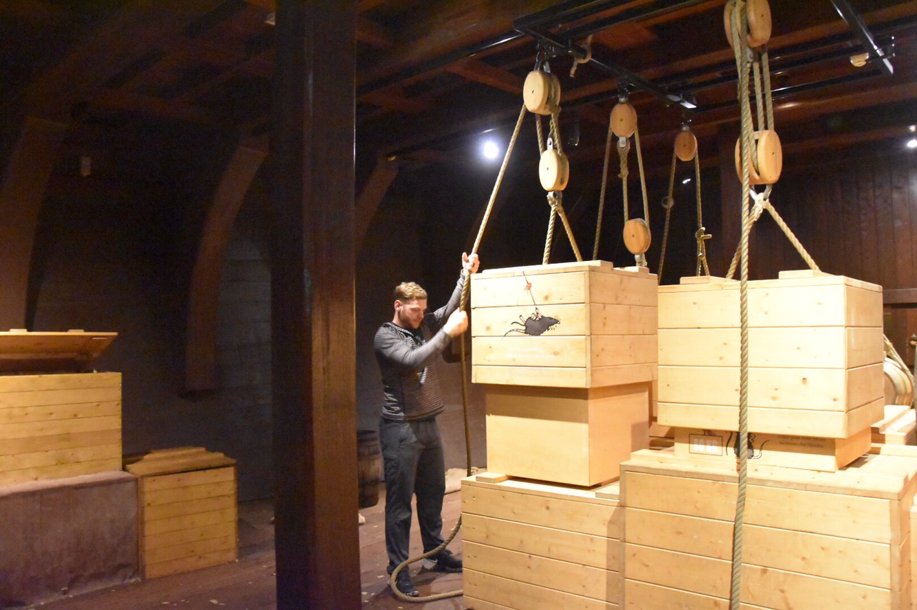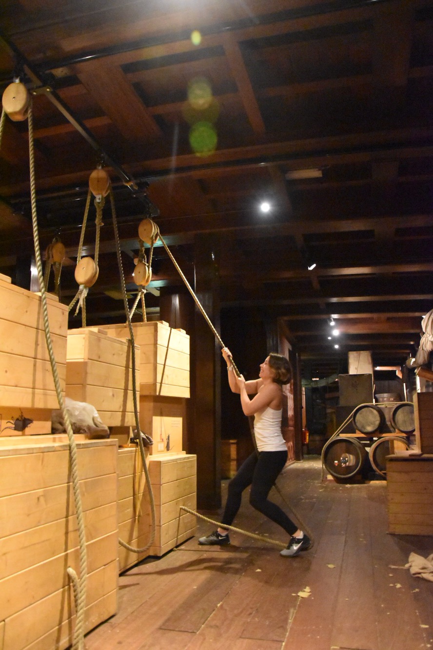 Down in the hold, the very bottom of the ship, we learned how pulleys can make life a lot easier when lifting heavy objects. They had stations that started with more pulleys and progressed to less. I couldn’t even budge the 1 pulley box, ha ha ha.