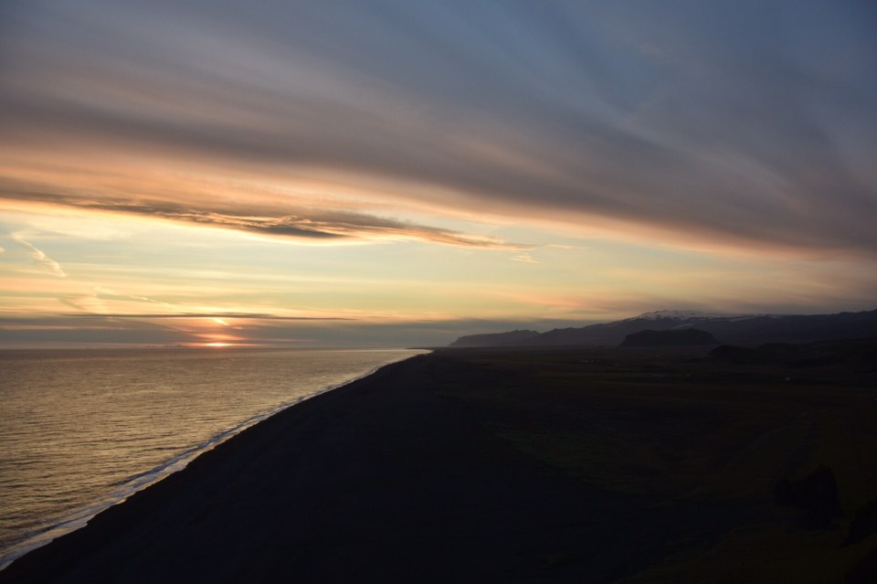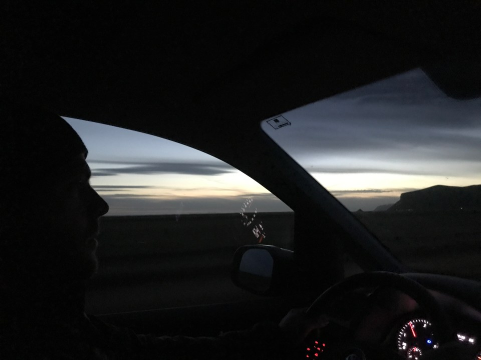 We noticed the sun was going down and we really wanted to be at Dyrhólaey peninsula for it, which was about 22 minute drive away. Problem was we didn’t anticipate the walk from car to beach to be a thirty plus minute walk. Zaq and I realized we spent longer than we meant to, getting lost in the fun, so we decided it was time for some cardio, ha ha ha…we jogged the whole way back. It was honestly amazing, I loved getting a steady pace and taking in the amazing scene, it’s not often I get to workout in such a place. Would have been great to be wearing actually workout clothes though. Not my insulating, cold weather gear. It got all kinds of sweaty in those 15 minutes it took to jog back. But no regrets.
